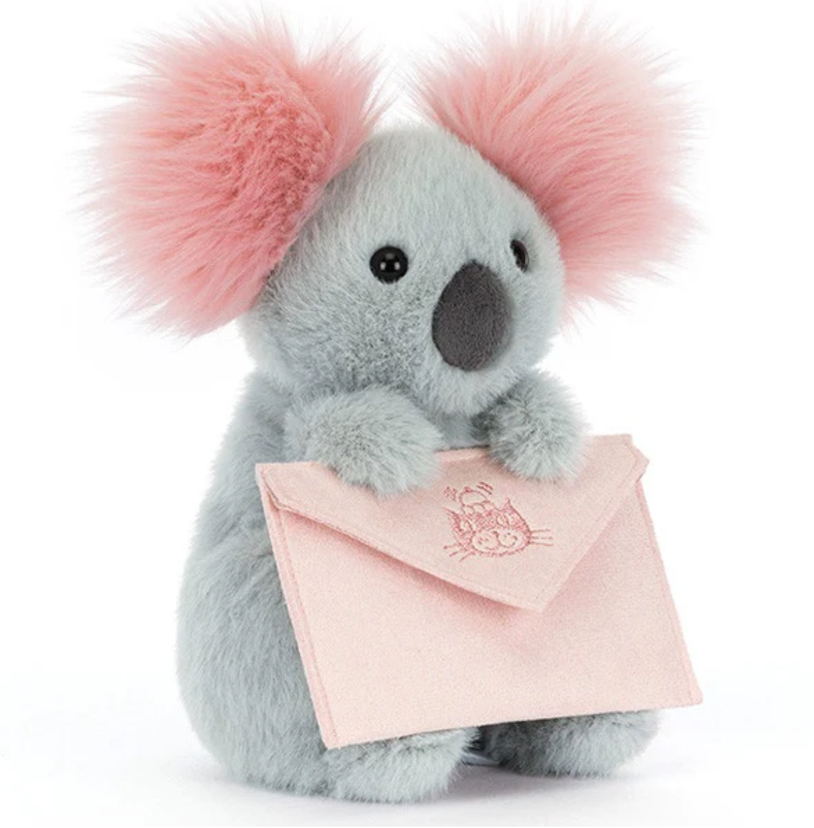 {"id":9119674761434,"title":"Jellycat Koala with Message","handle":"jellycat-koala-with-message","description":"\u003cp\u003eThis little Aussie is more than just a cuddly companion; he's a true believer in the uplifting power of a kind word and always ensures his letters are packed with cheer. Dressed in a perfectly plush charcoal-grey coat and sporting a sweet, friendly nose, this chap’s most dazzling feature has to be his gorgeous, fluffy, blush-pink inner ears, a perfect complement to his heart of gold.\u003c\/p\u003e\n\u003cp\u003eAt a handy 20cm, he’s the ideal size for a desk-side confidant or a perfectly pocketable pal, ready to offer silent encouragement or to remind you to send that cheerful note you've been meaning to write. Give this gorgeously gentle koala a squeeze, and let his soft-as-a-cloud texture melt away the worries of the day.\u003c\/p\u003e\n\u003cp\u003eSize: 20cm x 12cm x 11cm\u003c\/p\u003e","published_at":"2025-12-23T11:58:31-08:00","created_at":"2025-12-21T22:54:45-08:00","vendor":"Jellycat","type":"Toy","tags":[],"price":5200,"price_min":5200,"price_max":5200,"available":true,"price_varies":false,"compare_at_price":null,"compare_at_price_min":0,"compare_at_price_max":0,"compare_at_price_varies":false,"variants":[{"id":47236954620122,"title":"Default Title","option1":"Default Title","option2":null,"option3":null,"sku":null,"requires_shipping":true,"taxable":true,"featured_image":null,"available":true,"name":"Jellycat Koala with Message","public_title":null,"options":["Default Title"],"price":5200,"weight":0,"compare_at_price":null,"inventory_quantity":9,"inventory_management":"shopify","inventory_policy":"deny","barcode":"670983165784","requires_selling_plan":false,"selling_plan_allocations":[]}],"images":["\/\/littleleafbaby.ca\/cdn\/shop\/files\/ScreenShot2025-12-21at10.53.52PM.png?v=1766386444"],"featured_image":"\/\/littleleafbaby.ca\/cdn\/shop\/files\/ScreenShot2025-12-21at10.53.52PM.png?v=1766386444","options":["Title"],"media":[{"alt":null,"id":41200309108954,"position":1,"preview_image":{"aspect_ratio":0.983,"height":1188,"width":1168,"src":"\/\/littleleafbaby.ca\/cdn\/shop\/files\/ScreenShot2025-12-21at10.53.52PM.png?v=1766386444"},"aspect_ratio":0.983,"height":1188,"media_type":"image","src":"\/\/littleleafbaby.ca\/cdn\/shop\/files\/ScreenShot2025-12-21at10.53.52PM.png?v=1766386444","width":1168}],"requires_selling_plan":false,"selling_plan_groups":[],"content":"\u003cp\u003eThis little Aussie is more than just a cuddly companion; he's a true believer in the uplifting power of a kind word and always ensures his letters are packed with cheer. Dressed in a perfectly plush charcoal-grey coat and sporting a sweet, friendly nose, this chap’s most dazzling feature has to be his gorgeous, fluffy, blush-pink inner ears, a perfect complement to his heart of gold.\u003c\/p\u003e\n\u003cp\u003eAt a handy 20cm, he’s the ideal size for a desk-side confidant or a perfectly pocketable pal, ready to offer silent encouragement or to remind you to send that cheerful note you've been meaning to write. Give this gorgeously gentle koala a squeeze, and let his soft-as-a-cloud texture melt away the worries of the day.\u003c\/p\u003e\n\u003cp\u003eSize: 20cm x 12cm x 11cm\u003c\/p\u003e"}